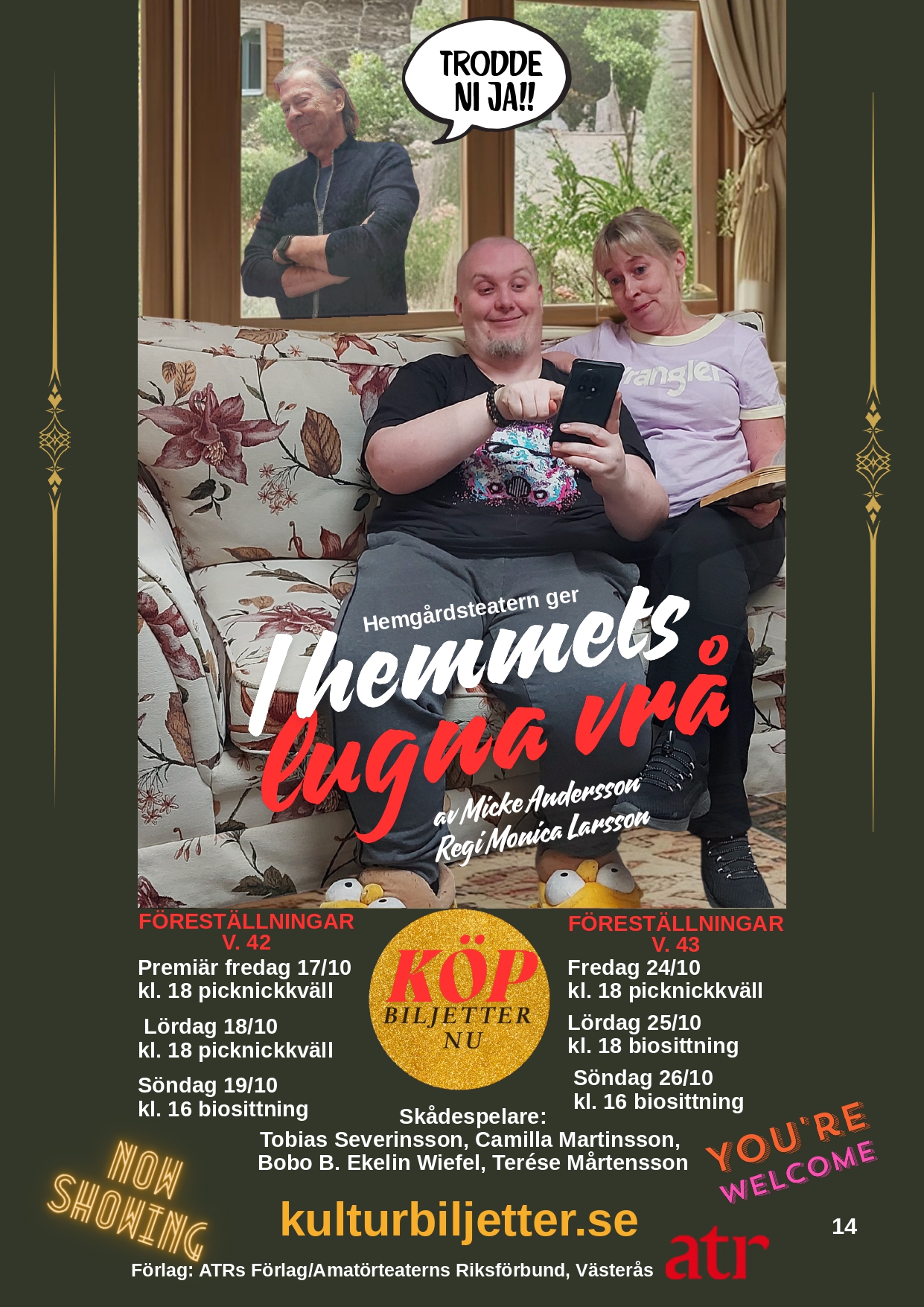 Idag var det dags för första repetitionen på "I hemmets lugna vrå" på Hemgården. Biljetterna är redan släppta, hälften med "Picknicksittning" d.v.s ta med dig egen mat och dryck om så önskas och hälften med biosittning d.v.s ingen egen förtäring tillåten, men möjlighet att köpa fika i pausen.
