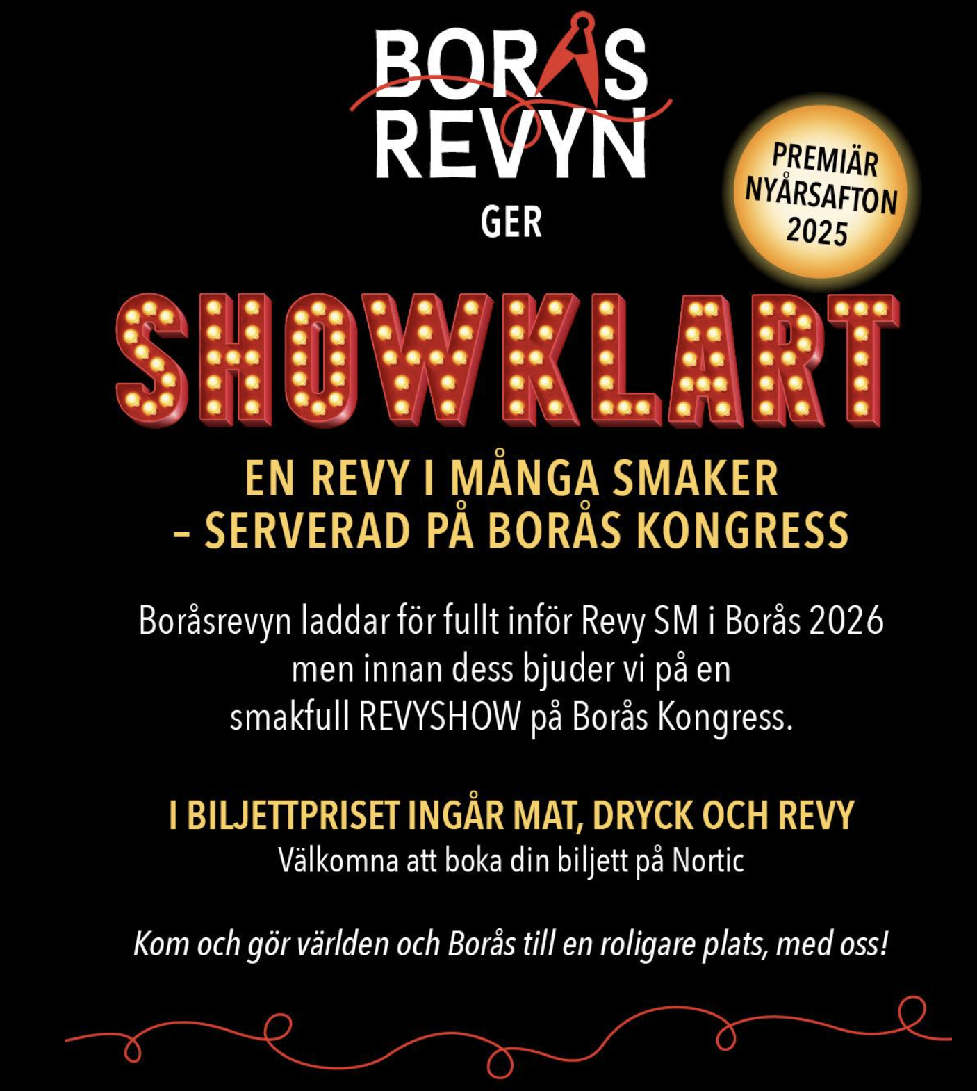 För tretton år sedan var jag på en audition för Boråsrevyn, för 14 dagar sedan hörde Lars G Svensson av sig och frågade om jag ville vara med i årets Nyårsrevy. Behövde inge längre betänketid, har ju tänkt på det i tretton år. Vad säger man "Bättre sent än aldrig". Ska bli så kul att få vara en del av detta proffsiga gäng. Det blir något som ni inte vill missa! Biljetterna släpps inom kort.